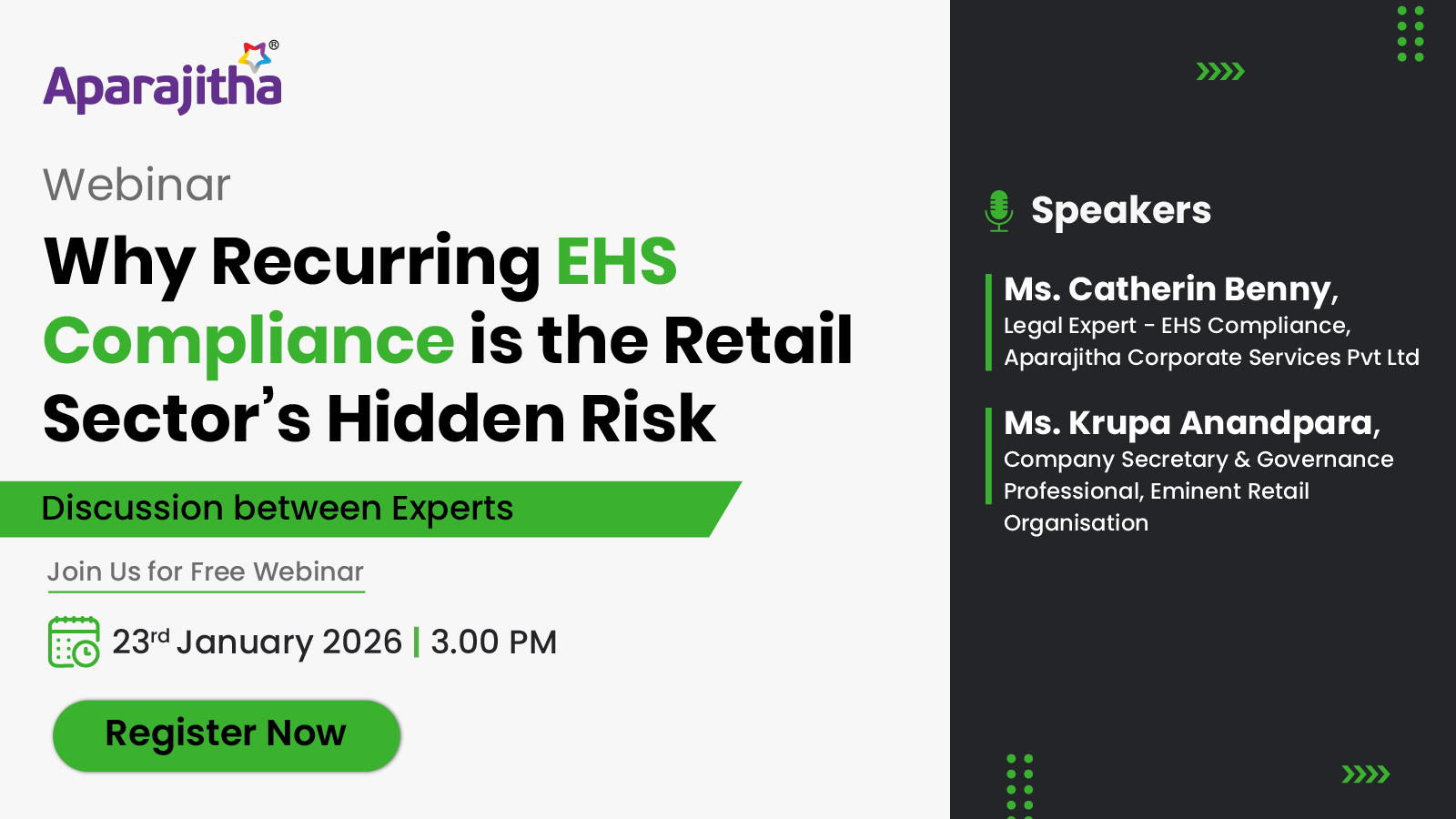 Join Our Free Webinar: Beyond Licenses Date: 23th Jan, 2026, Time: 3.00 pm to 4:00 pm Speaker: Ms. Catherin Benny—Legal Expert—EHS Compliances, Aparajitha Corporate Services Private Limited Driving strategic EHS